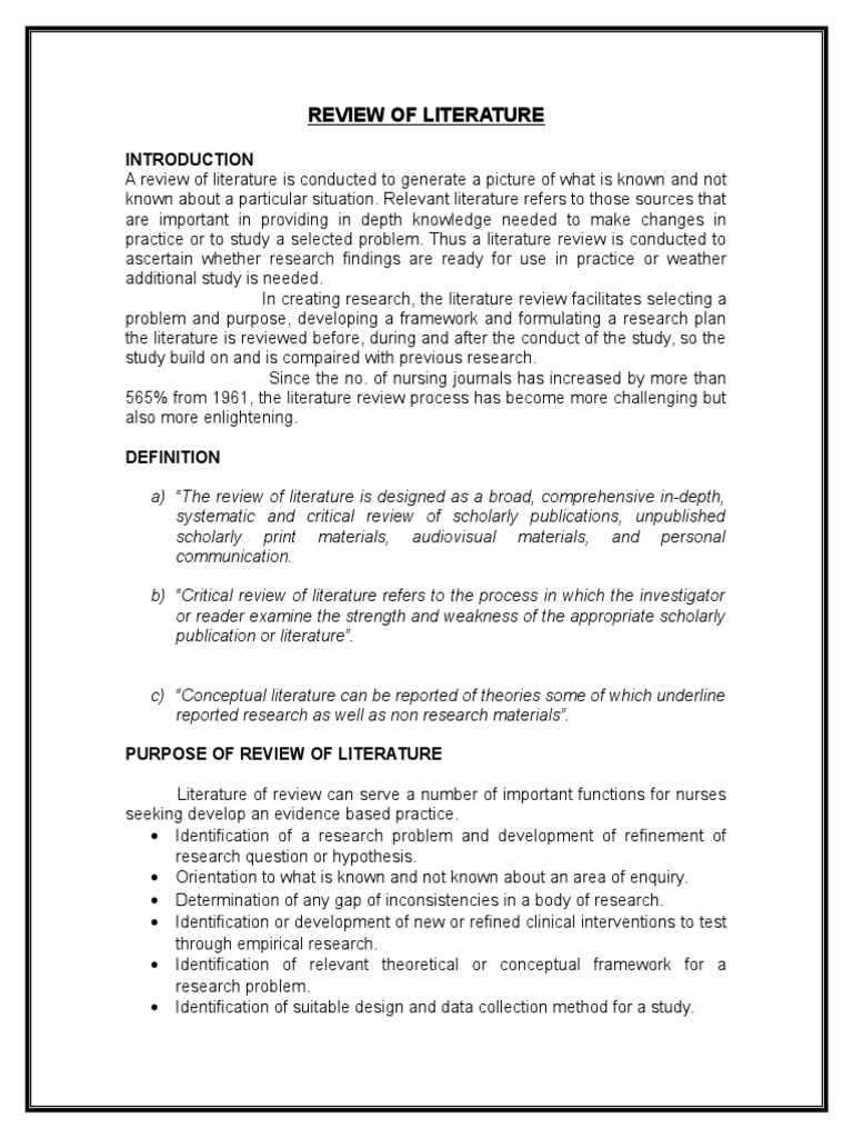 For us look at this in more detail. This forms the literature review for the review. The qualitative purpose of the review is to introduce the readers to the need for conducting the said research. A literature review should begin with a thorough literature search using the main keywords in relevant online databases such as Google ScholarPubMedetc.